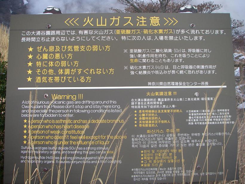 大涌谷は前述の箱根本でしっかりチェック済みでしたので、ロープウェイ降りたらまずは自然研究路(遊歩道)歩いて~、噴煙見て~、黒たまご食べて寿命延ばして~、などと考えていたのですが、そのウキウキはロープウェイを降りた瞬間に薫ってきた硫黄の臭いにより粉々に打ち砕かれました。